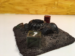 These are my new Objective Marker sets. They consist of nine 4x4 inch pieces with random boxes, barrels and the debris of a sci fi setting. Each piece has one or two numbers airbrush stenciled onto a box or barrel for easy indication of which objective it is.